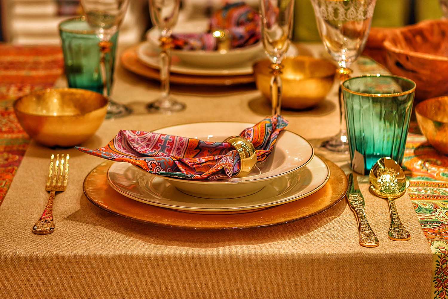 Décorer la salle à manger pour fêter le Ramadan peut se faire en utilisant des textiles élégants. Habillez votre table avec des nappes et des serviettes aux motifs arabesques ou géométriques. Les textiles aux couleurs riches comme le bordeaux, le bleu nuit ou le vert émeraude ajoutent une touche d’élégance à votre salle à manger.