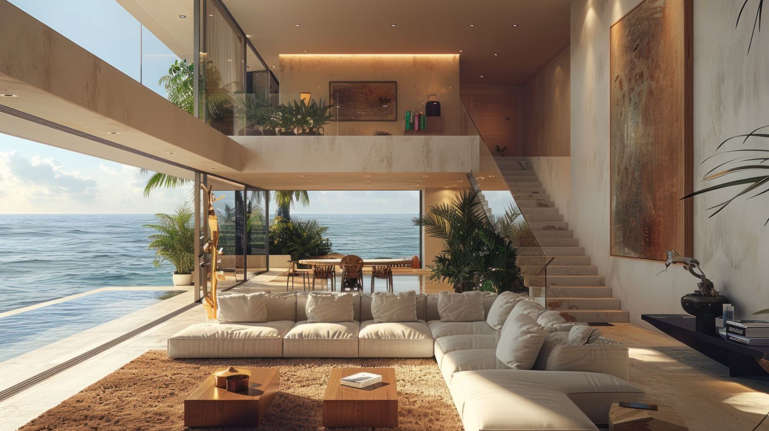 Un aménagement de luxe en bord de mer privilégie les matériaux haut de gamme. En effet, le bois exotique, le marbre, le travertin ou encore la pierre naturelle se combinent parfaitement avec le bleu de l’océan. Par ailleurs, les larges baies vitrées, associées à des menuiseries raffinées, permettent de profiter pleinement de la lumière et de la vue superbe sur la mer.
